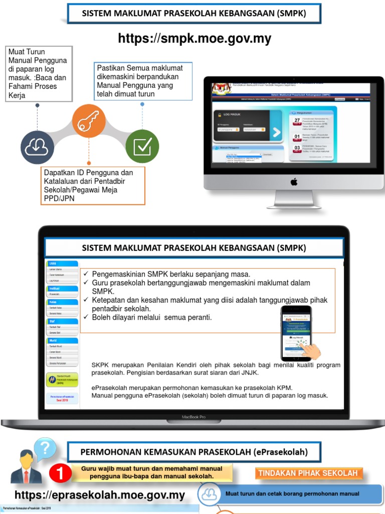 Permohonan boleh mengakses laman sesawang eprasekolah melalui pautan berikut Eprasekolah ialah satu tempat pendaftaran murid ke prasekolah atau tadika yang diisi sendiri oleh ibubapa murid dan bukannya guru. Pemilihan murid dilaksanakan di peringkat sekolah melalui jawatankuasa pemilihan murid prasekolah dan keputusan. Smpk prasekolah ataupun sistem maklumat prasekolah kebangsaan merupakan sistem maklumat yang bersepadu di peringkat kebangsaan yang bertujuan untuk memastikan capaian data di semua peringkat secara berpusat dengan cepat dan tepat. Kaedah pertama permohonan adalah melalui pendaftaran secara atas talian.